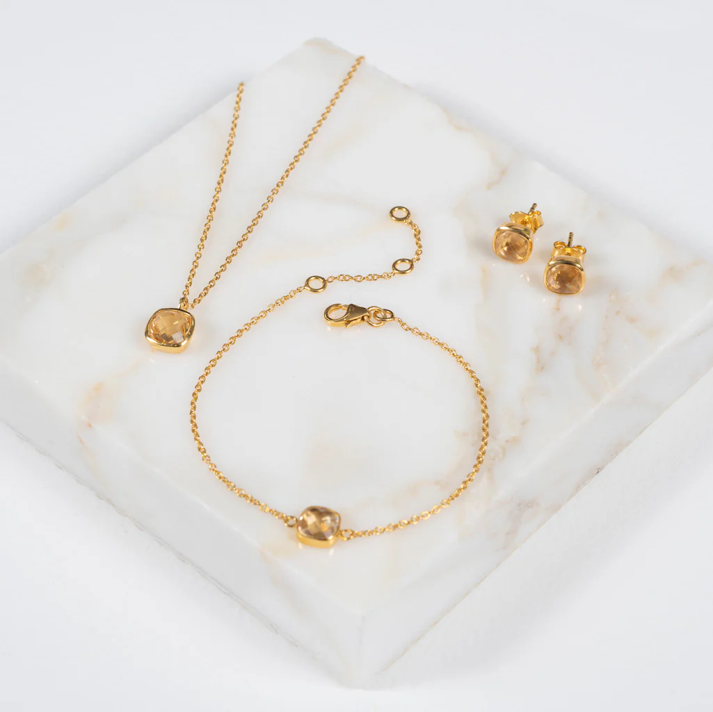 A pretty cushion-cut citrine gemstone set in polished 18ct Yellow Gold Vermeil on an adjustable durable chain. It can be worn at three different lengths making it extremely versatile and perfect for layering.