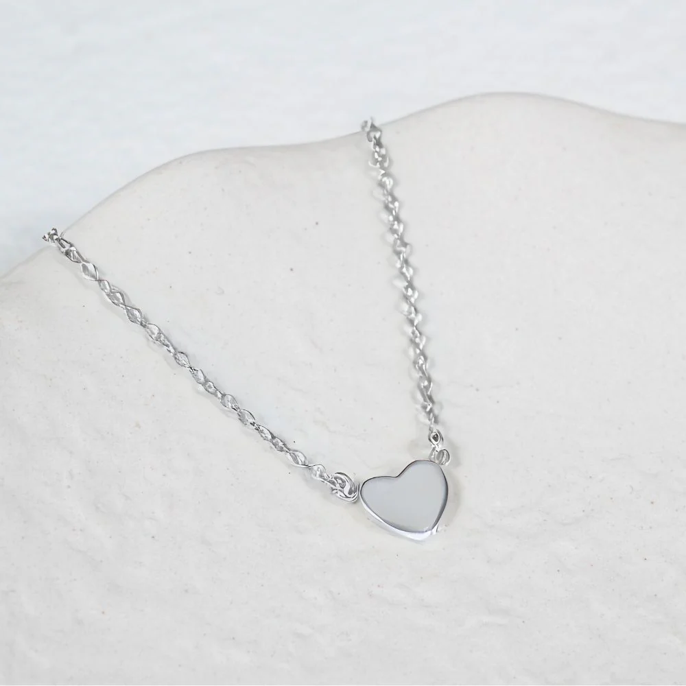 A solid Sterling Silver heart pendant securely attached to an adjustable fine trace chain.